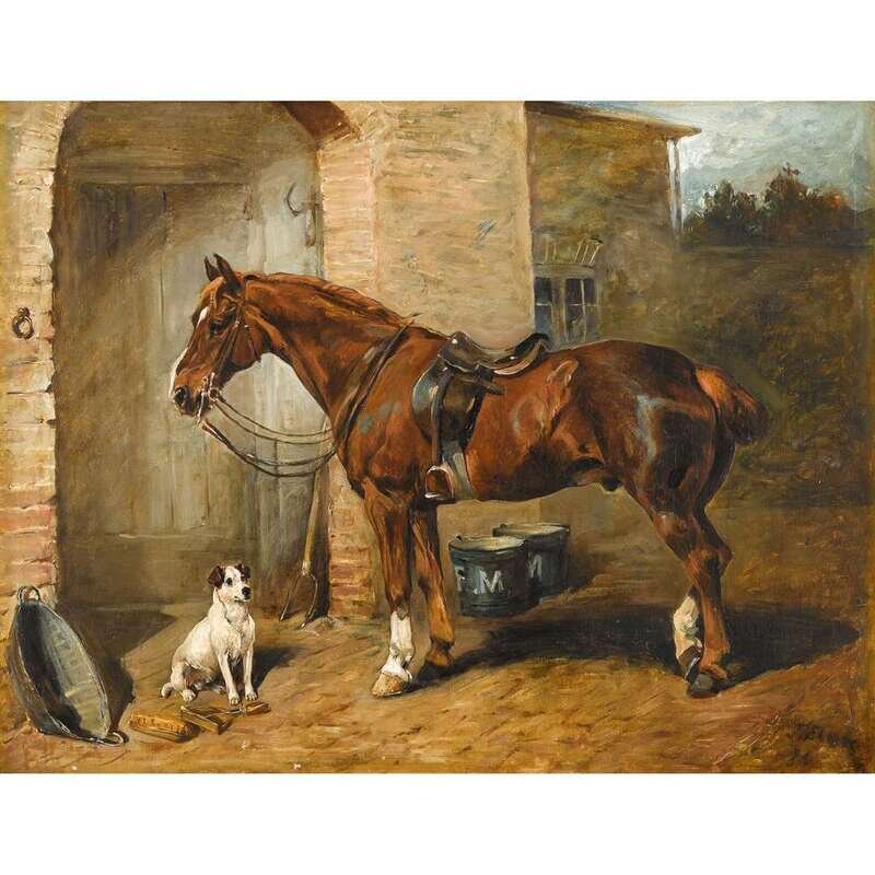 JOHN EMMS (BRITISH 1843-1912) HUNTER IN STABLE YARD WITH TERRIER