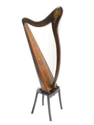 The soundboard and body decorated with scrolling Celtic designs, for 31 strings, on its original stand, height of harp: 39-1/2", soundboard width: 11"