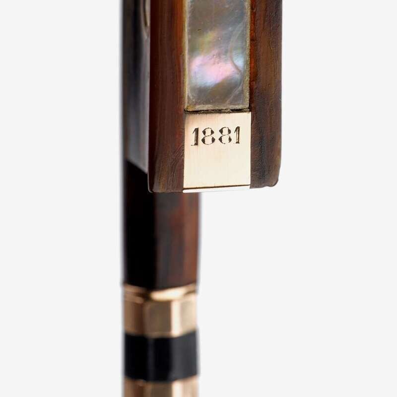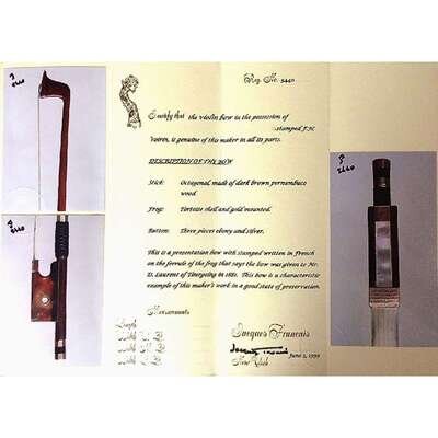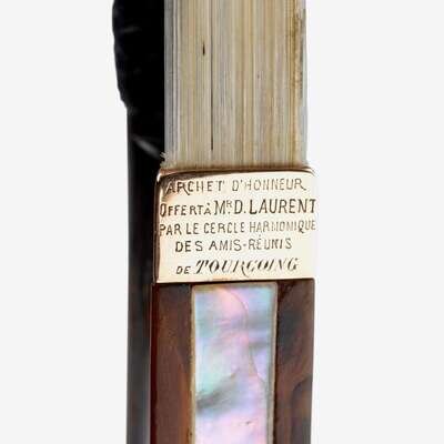 Gold-mounted tortoiseshell frog, octagonal pernbuco stick stamped: F.N.VOIRIN A PARIS; the gold ferrule engraved: ARCHET D'HONNEUR/ OFFERT A Mr. D. LAURENT/ PAR LE CERCLE HARMONIQUE/ DES AMIS REUNIS/ De TOURCOING; the bottom plate engraved 1881.