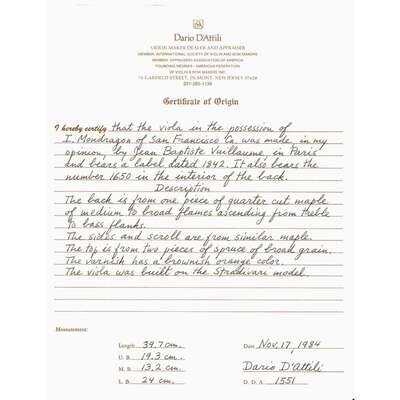 Labeled: Jean Baptiste Vuillaume a Paris/ rue Croix des Petits Champs; bearing the Vuillaume number 1650 inscribed on the inside back. Certificate: Dario D'Attili, November 17, 1984.