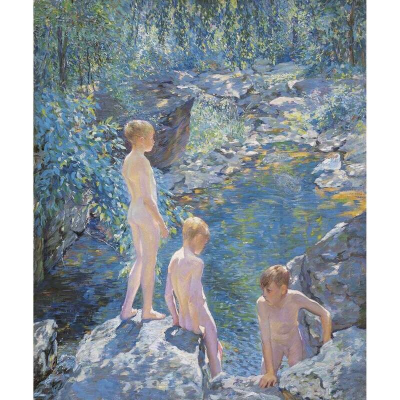 ROY CLEVELAND NUSE (AMERICAN 1885-1975) "THREE BOYS AT THE SHEEPHOLE"