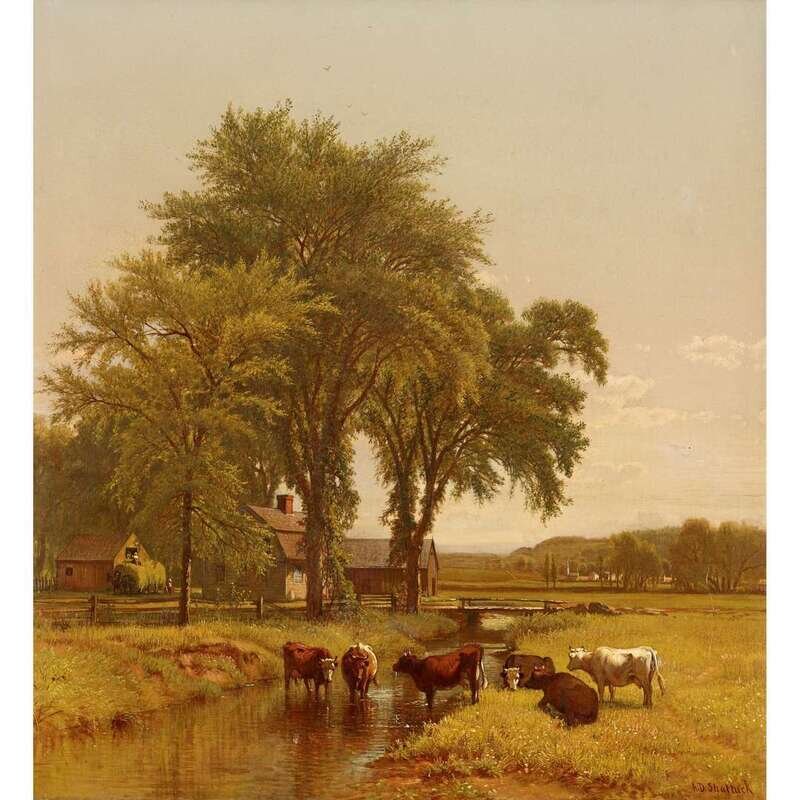 AARON DRAPER SHATTUCK (AMERICAN 1832-1928) COWS WATERING ON THE FARM