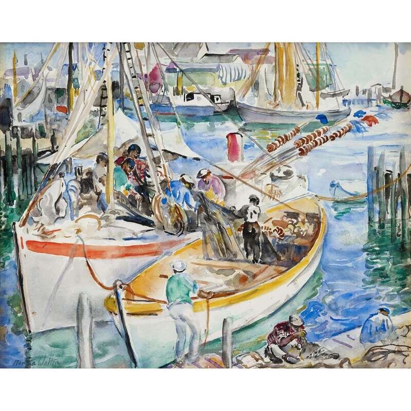 MARTHA WALTER (AMERICAN 1875-1976) FISHERMEN UNLOADING NETS, GLOUCESTER