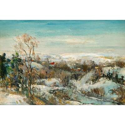WALTER EMERSON BAUM (AMERICAN 1884-1956) HILLY WINTER LANDSCAPE WITH RIVER