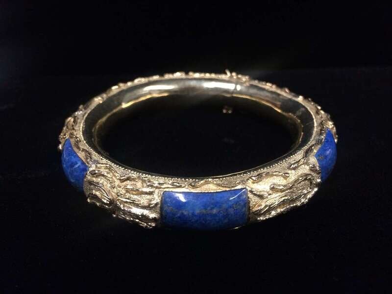 hinged bangle set with lapis lazuli segments and textured gold accents.