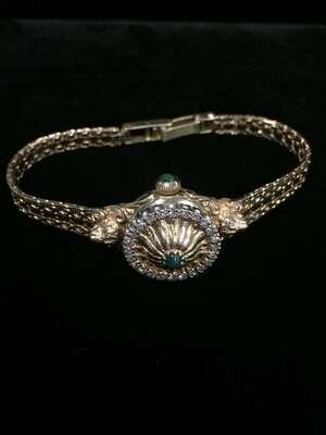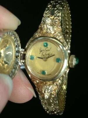 17 jewel Ross Watch Co. movement, unadjusted, round-cut emerald dial and single-cut diamond accents.