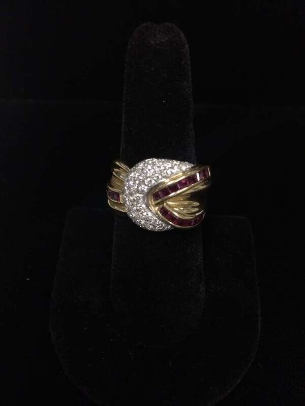 set with calibré-cut rubies and pavé-set diamonds; total diamond weight approximately: 0.75 carat.