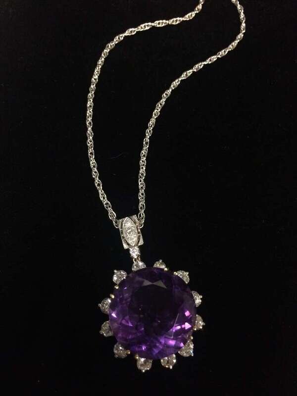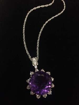 centering a round-cut amethyst weighing approximately: 30.00 carats; in an old mine-cut diamond surround; total diamond weight approximately: 2.75 carats, on a fourteen karat white gold chain.