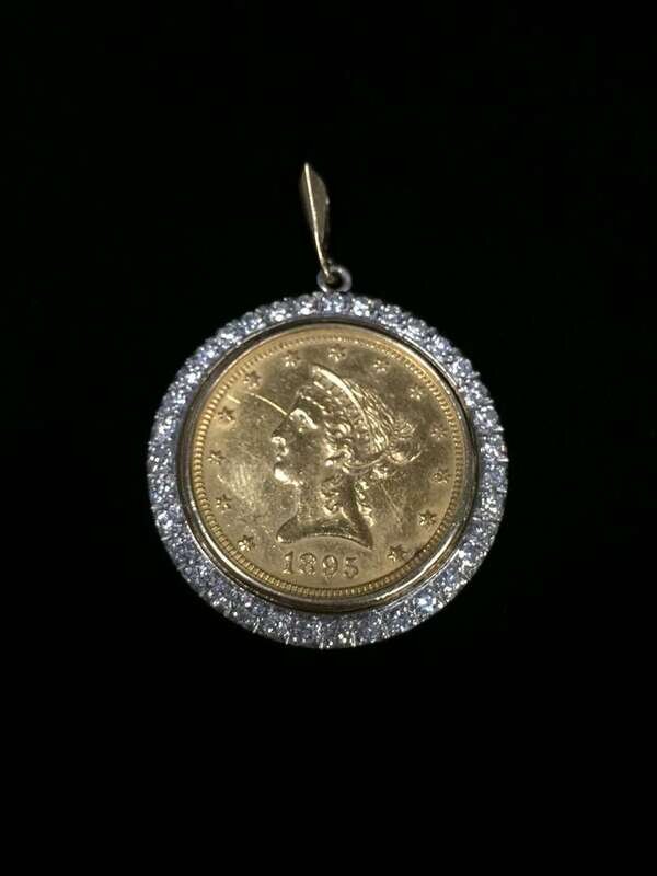 centering a 1895 United States ten dollar gold coin in a full-cut diamond surround; total diamond weight approximately: 1.00 carat.