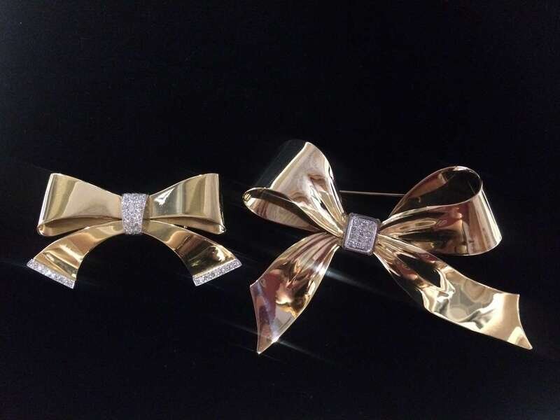 including fourteen and eighteen karat gold: both designed as ribbon bows with pavé-set diamond accents; total diamond weight approximately: 1.05 carats.