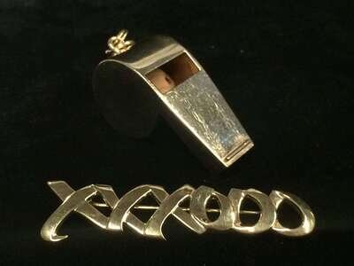 including fourteen and eighteen karat gold; comprised of one gold whistle pendant, signed Tiffany (obscured) and one XO brooch, signed Tiffany & Co. Paloma Picasso and dated 1983.