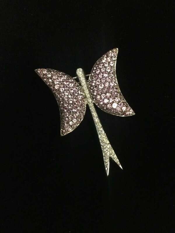 designed as a butterfly with round-cut pink stone wings and full-cut diamond-set body; total diamond weight approximately: 0.40 carat.