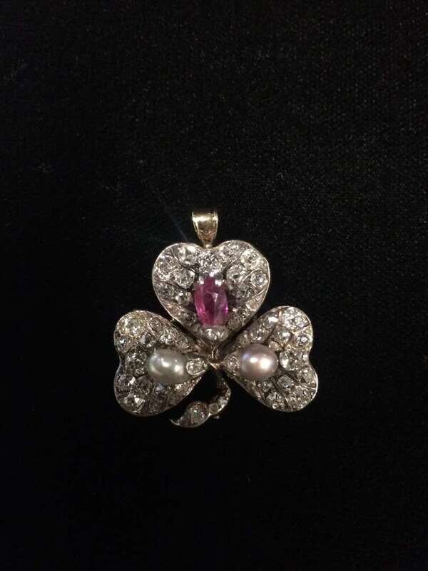 designed as a clover set with old mine-cut diamonds centering a pear-shaped ruby and pearl accents; total diamond weight approximately: 2.00 carats.