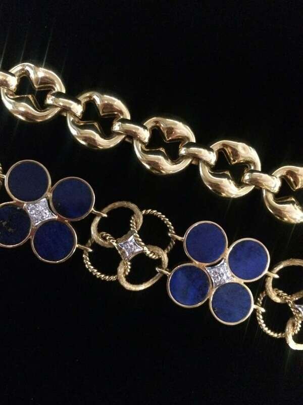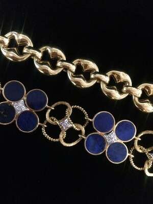 A collection of two diamond, lapis lazuli and fourteen karat gold bracelets