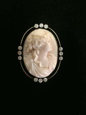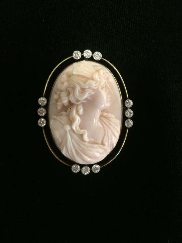 carved coral depicting the bust of a woman accented by transitional-cut diamonds; total diamond weight approximately: 0.70; signed Brocks & Co.