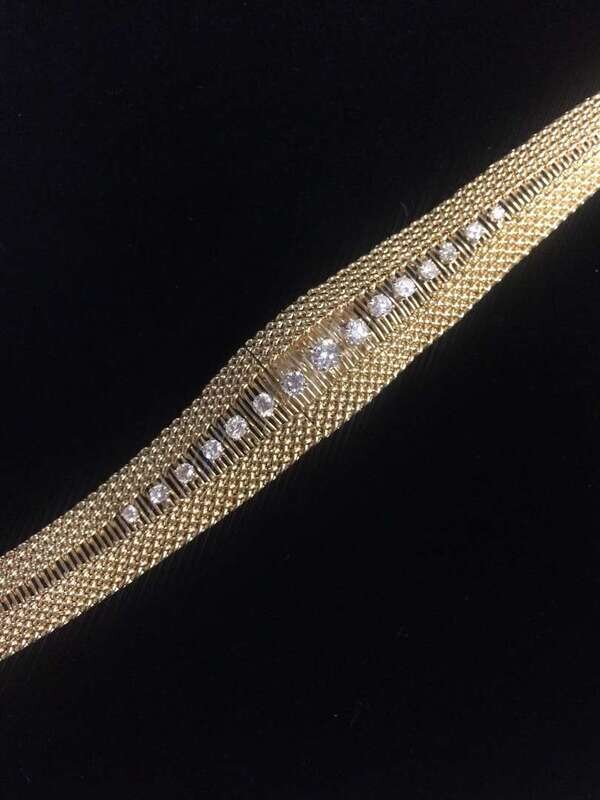 17 jewel movement, unadjusted; woven gold bracelet and cover centering full-cut diamonds; total diamond weight approximately: 1.75 carats.