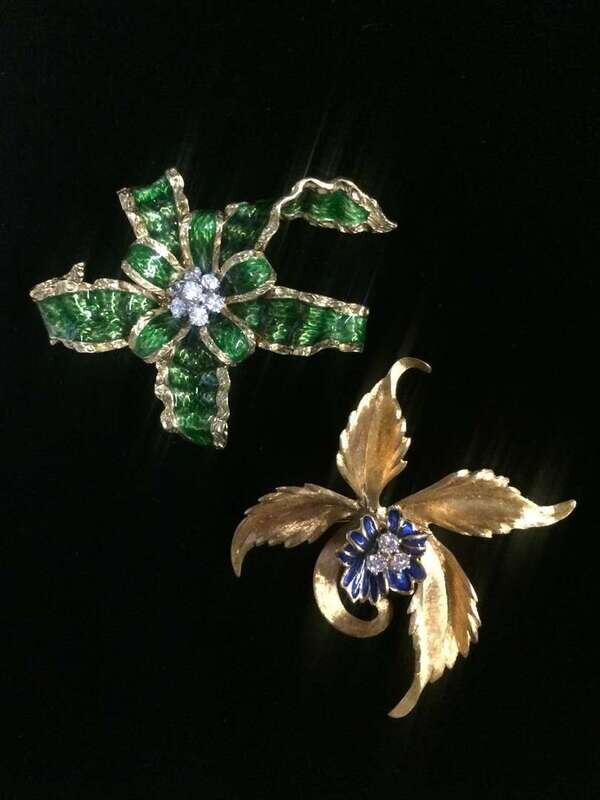 A collection of two diamond, gemstone, enamel and eighteen karat gold brooches