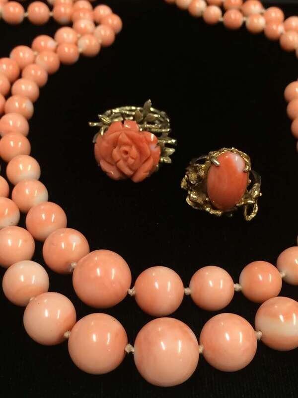 consisting three necklaces, one with beads measuring approximately: 6.5 to 13.8mm and one with carved coral flower stations; and one ring *Please note: only select items shown in image.