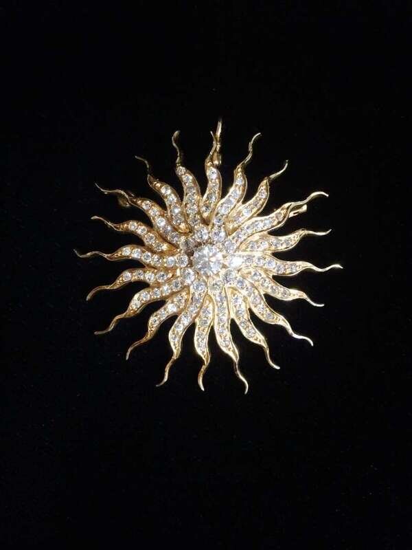 designed as a sunburst centering an old European-cut diamond weighing approximately: 0.45 carat; and set throughout with old European and single-cut diamonds; total remaining diamond weight approximately: 1.95 carats.