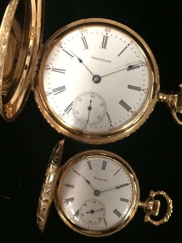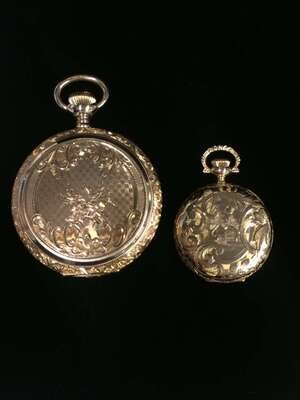 17 jewel Waltham movement no. 12487851, screw set, bi-metallic split balance, case no. 427702. 15 jewel Elgin movement no. 15680647, screw set, bi-metallic split balance, case no. 5073325.