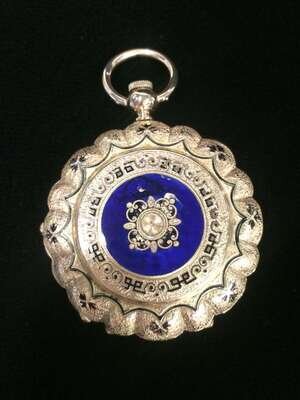 15 jewel movement, key wind, key set, scalloped enamel case with rose-cut diamonds.