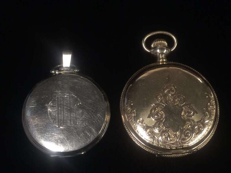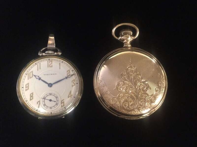 open face white gold Waltham, 17 jewel movement no. 27383398, screw set, split, bi-metallic balance. Hunting case gold Elgin, 15 jewel movement no. 7774309, screw set, split, bi-metallic balance.