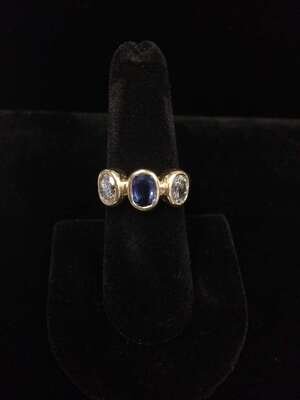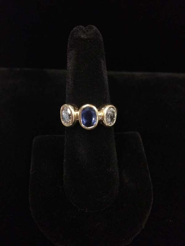 centering a bezel-set oval-cut sapphire weighing approximately: 0.90 carats; flanked on both sides by bezel-set oval-cut diamonds; total diamond weight approximately: 1.10 carats.