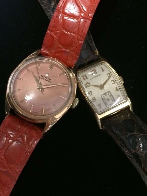 including an eighteen karat gold automatic by Zenith, 20 jewel movement no. 4625606, case no. 662156. Together with a Longines and a Hamilton, both are 14 karat and mechanical. *Please note: only select items shown in image.