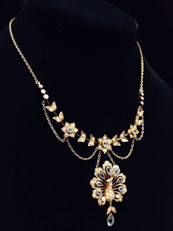 designed as a foliate motif swag set with seed pearls and blue stones, terminating in a gem-set and seed pearl peacock.