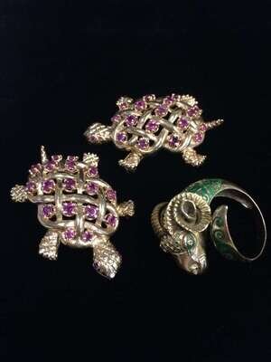 including two turtle pins and a rams head ring.
