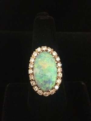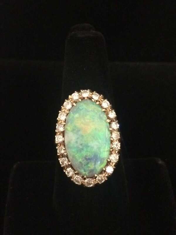 An opal, diamond and fourteen karat gold ring
