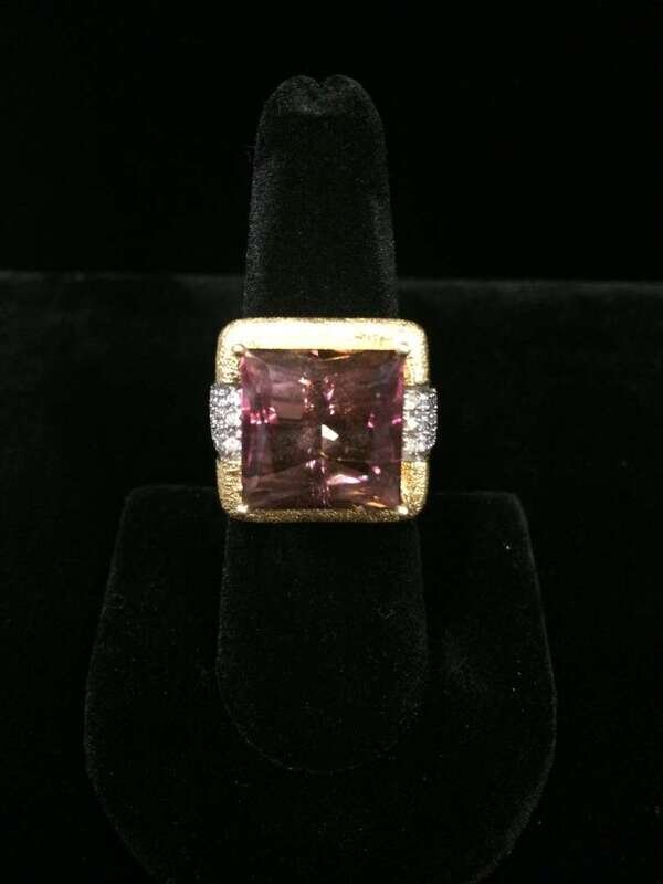 centering a princess-cut pink tourmaline with pavé-set diamond accents.