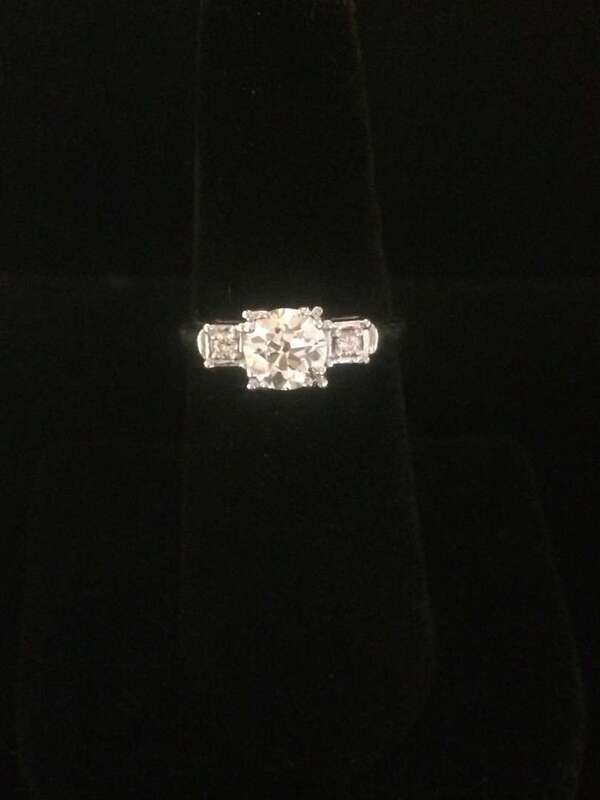centering an old european-cut diamond weighing approximately: 0.85 carat; flanked by full-cut diamonds.