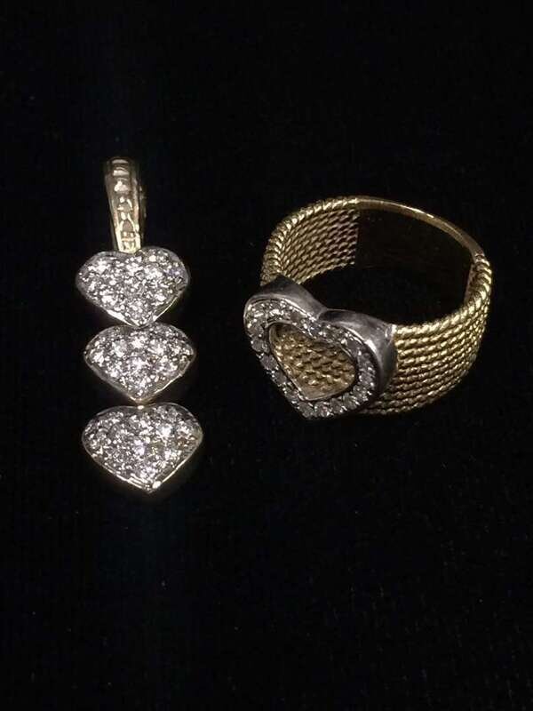 including fourteen and eighteen karat gold; one pendant with three pavé-set diamond hearts and one heart ring set with full-cut diamonds; total diamond weight approximately: 0.90 carat.