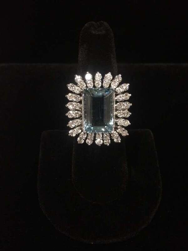 centering a step-cut aquamarine weighing: 7.20 carats; in a full-cut diamond surround; total diamond weight approximately: 2.00 carats.