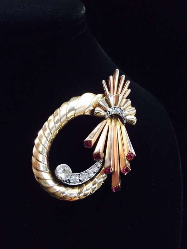 *A Retro diamond, synthetic ruby and fourteen karat two-tone gold brooch