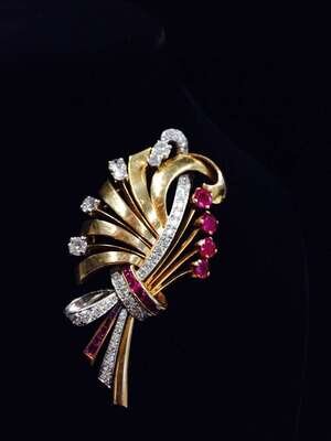 *A Retro diamond, ruby, platinum and eighteen karat gold brooch