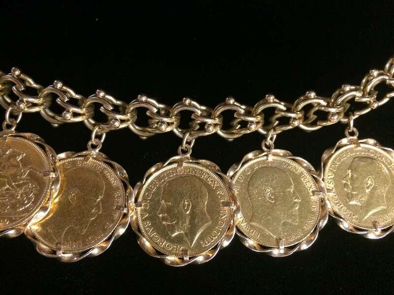 with seven gold British sovereigns in twisted gold surrounds.