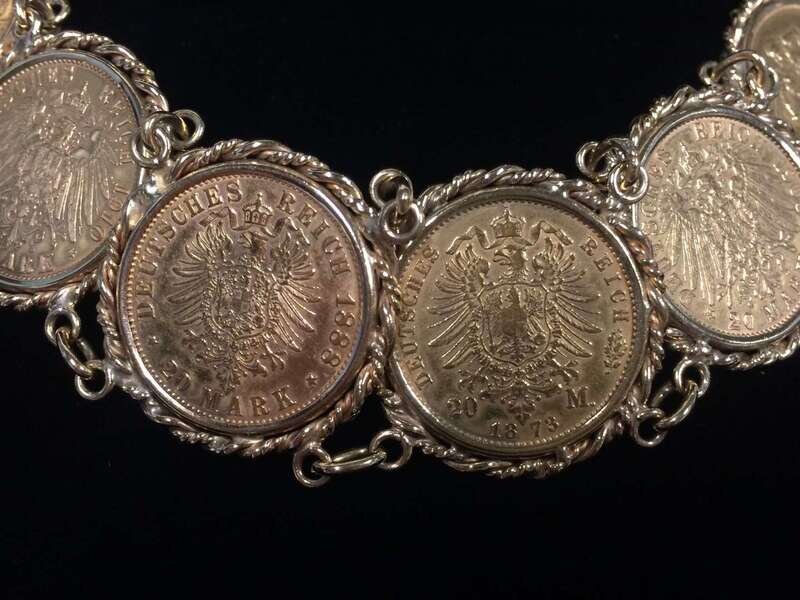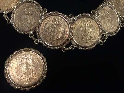 consisting of a bracelet and brooch; set with gold coins of various countries and denominations in twisted gold surrounds.