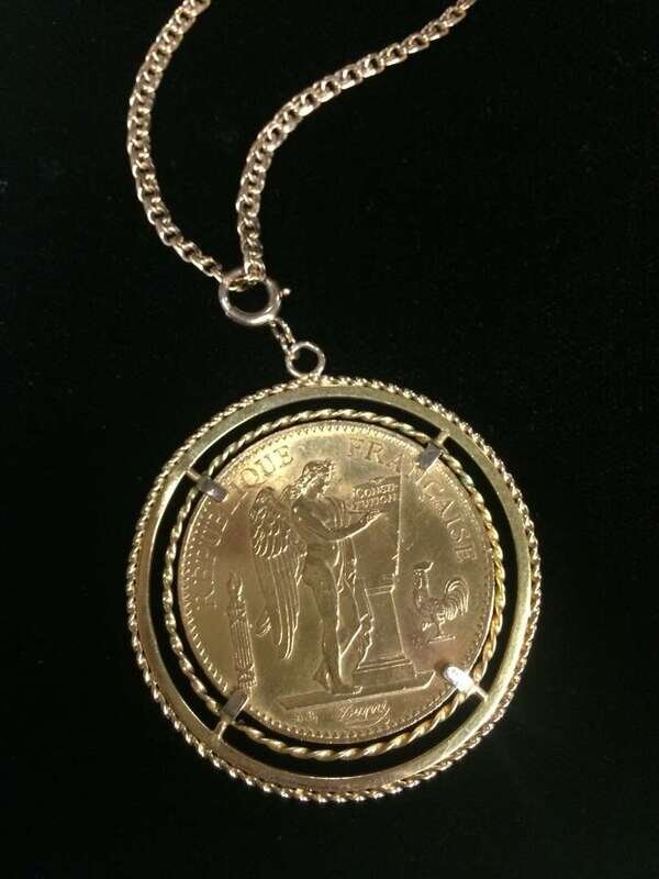 centering a one hundred Franc in a twisted gold surround; with Italian assay and British hallmarks.