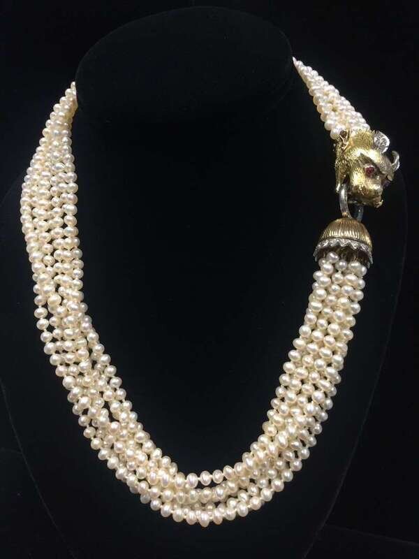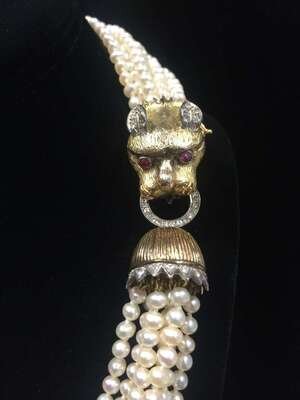 with eight strands of fresh water pearls completed by a clasp in the form of a dogs head with rose-cut ruby eyes and accented with full and single-cut diamonds; total diamond weight approximately: 0.80 carat.