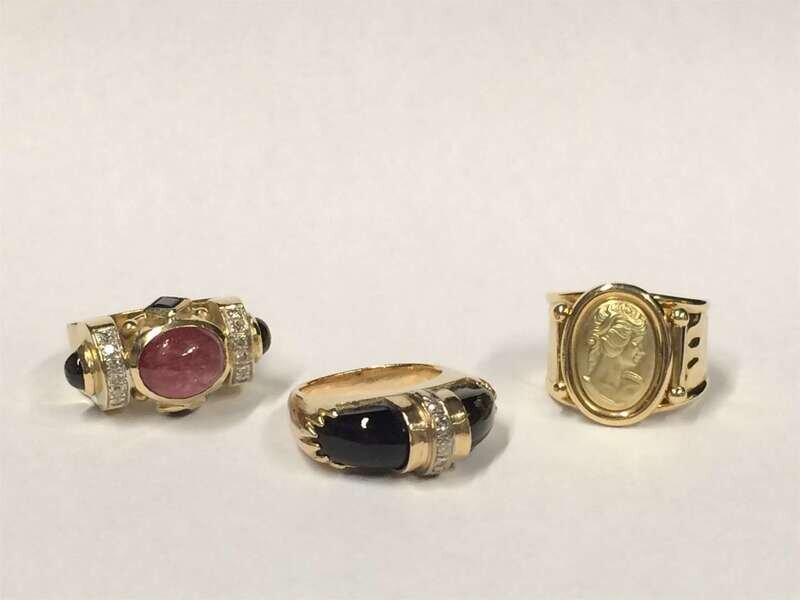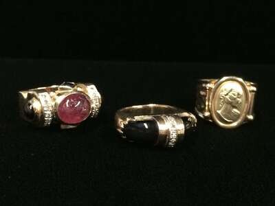 A collection of three gem-set, diamond and fourteen karat gold rings