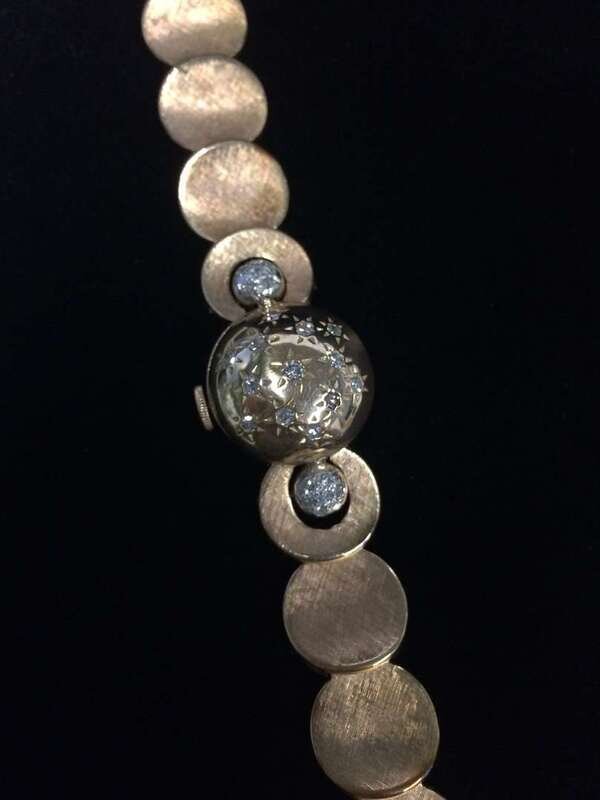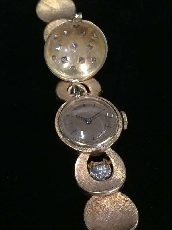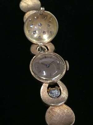 17 jewel Pery movement no. 67073, unadjusted; with domed covered dial set with full and single-cut diamonds and pavé-set diamond accents; florentine finished gold links; total diamond weight approximately: 0.50 carat; accompanied by additional links.