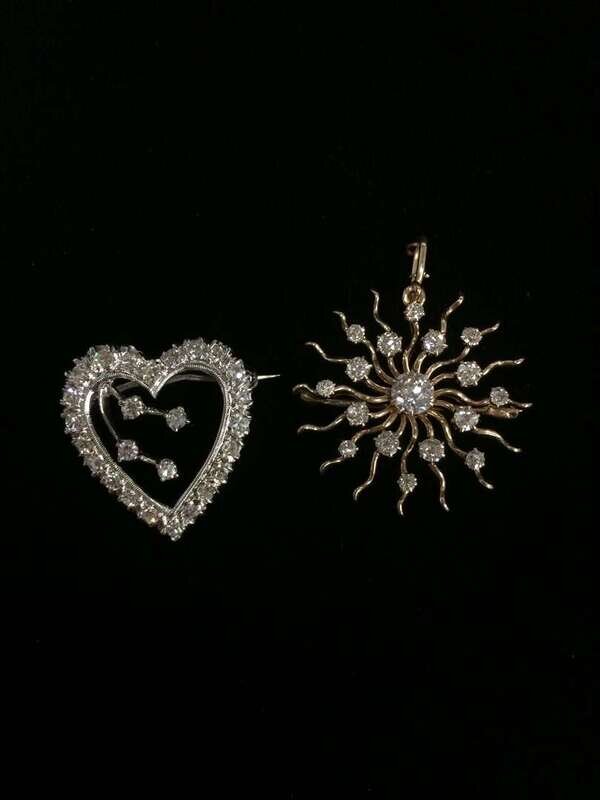 one designed as a sunburst set with old European and old mine-cut diamonds; one designed as a heart set with single-cut diamonds; total diamond weight approximately: 2.15 carats.