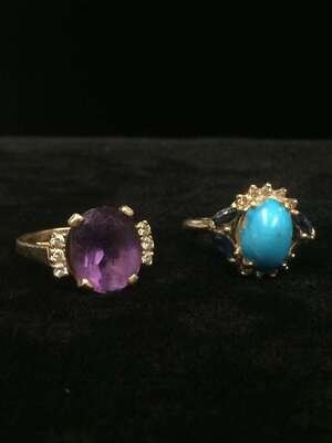 *A collection of three gem-set, synthetic gemstone, diamond and fourteen karat gold rings
