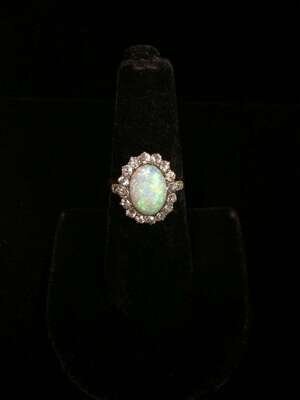 centering a cabochon opal in an old mine-cut diamond surround; total diamond weight approximately: 0.75 carat.