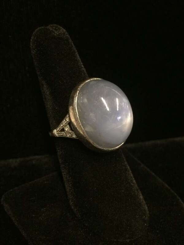 centering an oval cabochon star sapphire weighing approximately: 38.70 carats; single-cut diamond accents.