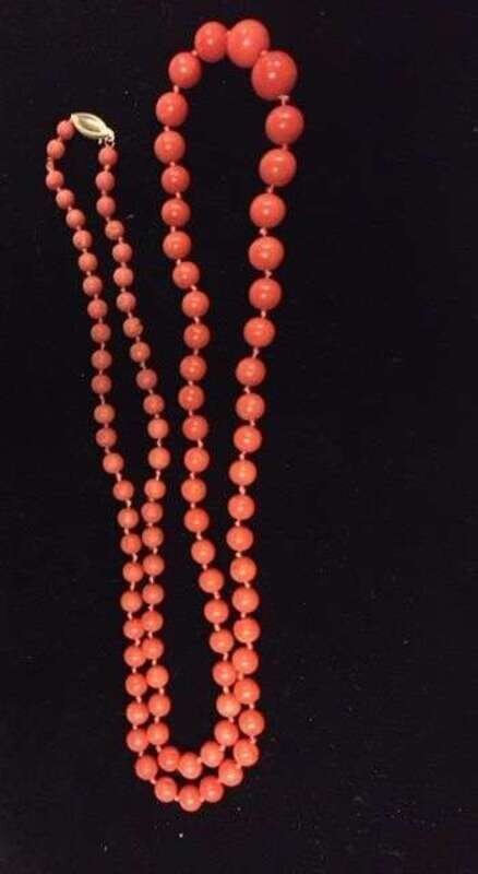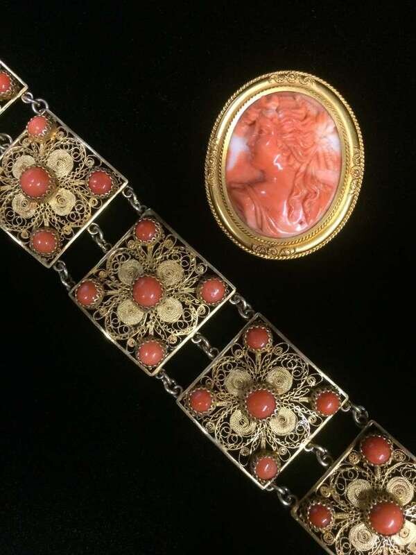 A collection of coral, silver and gold jewelry