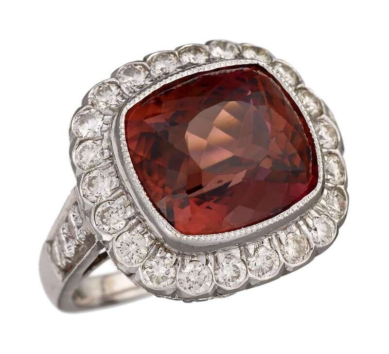 centering a modified cushion-cut pink tourmaline in a full-cut diamond surround; total diamond weight approximately: 1.10 carats.