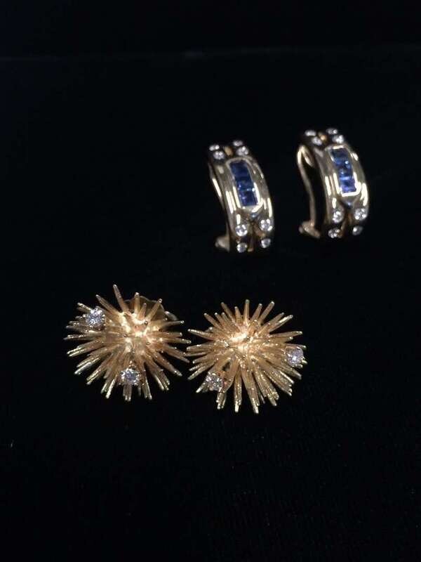 A collection of two pairs of diamond, sapphire and fourteen karat gold earrings